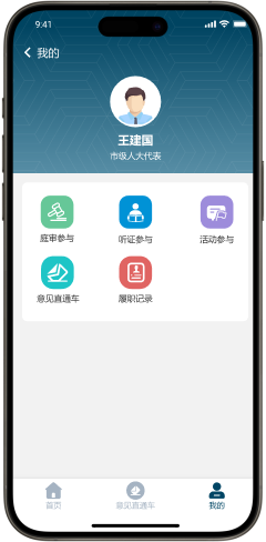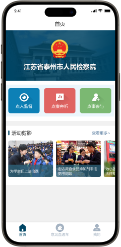主要功能模块:点人监督、点案旁听、点事参与,活动剪影,意见直通车。