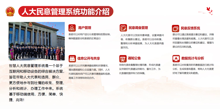 民意管理系统是一个基于互联网和移动设备的综合解决方案,旨在帮助人大代表和选民、群众、更方便地参与到社情的收集、整理、分析和统计、办理工作中来。系统基于移动端使用,方便,简单、快捷、高效!