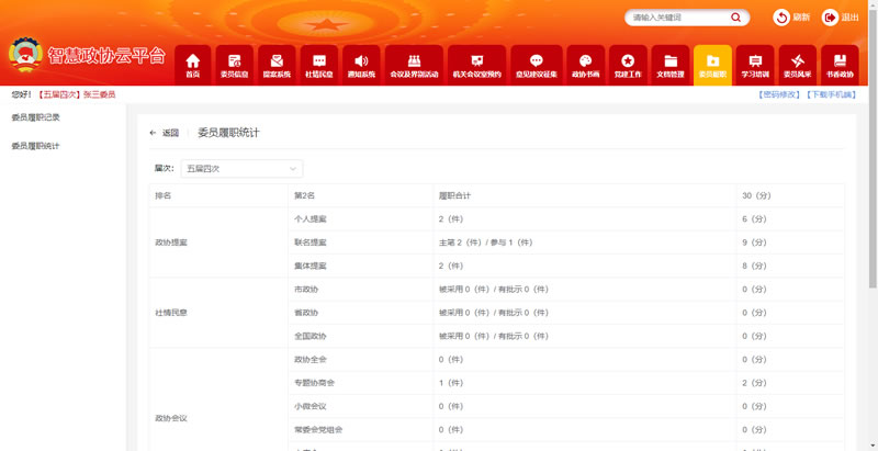 委员考核管理:对委员履职情况采用积分制形式进行考核,针对委员议案提交情况、社情民意处理情况、政协活动参与情况、政协会议出席情况、其他履职情况等方面进行全面的考核记录,以积分形式反应各项考核内容,直观、简单、有效。